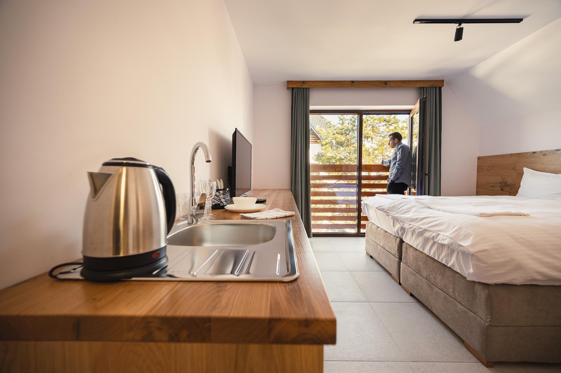 Studio 32 m², with 180x200 size bed or two single beds 90x200, kitchenette (mini fridge, electric kettle, dining table, chairs), flat-screen TV, bathroom (Toilet, bath or shower, towels, hairdryer, toilet paper), 95% with balcony, floor heating, free WiFi. Socket near the bed.